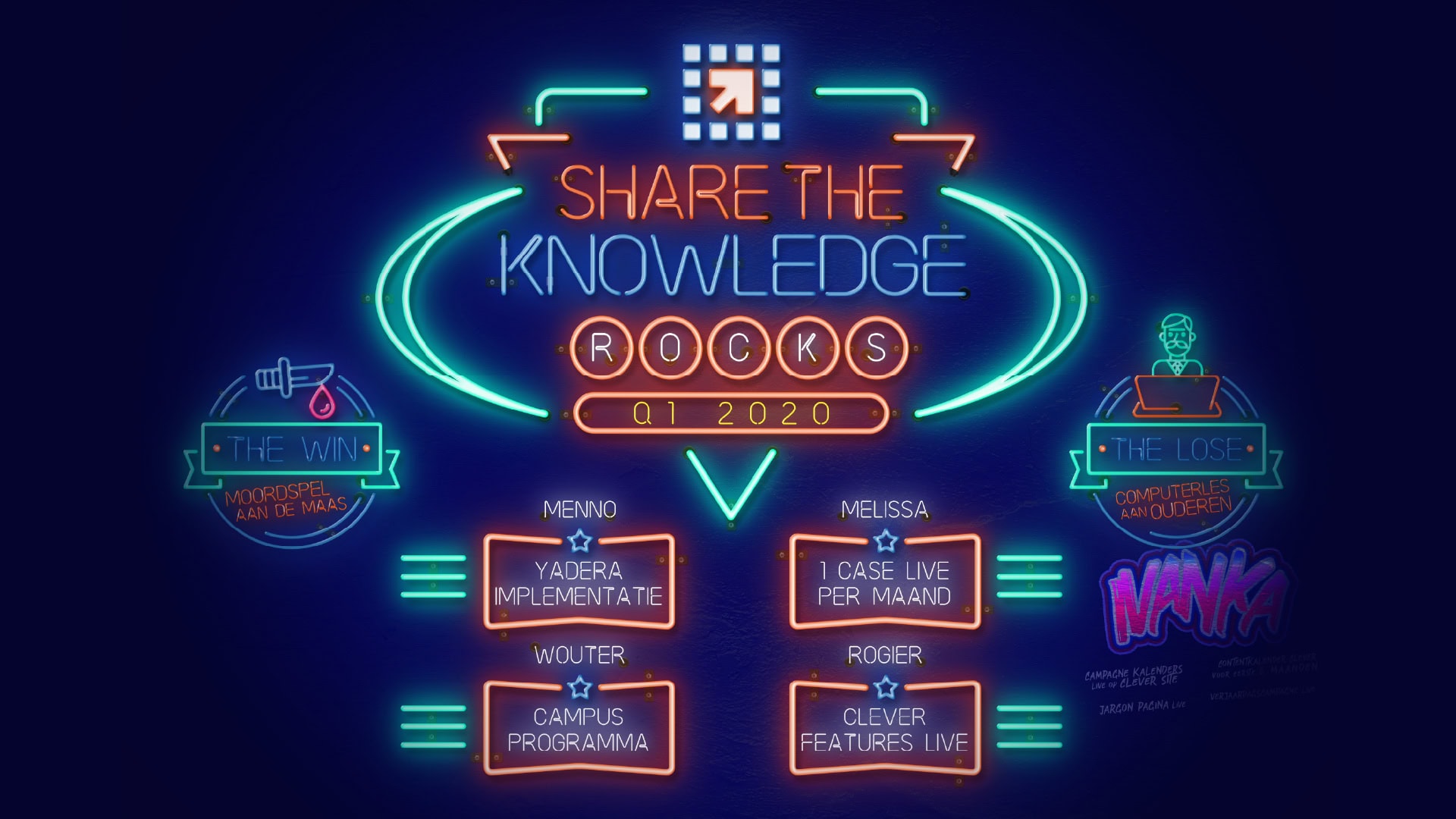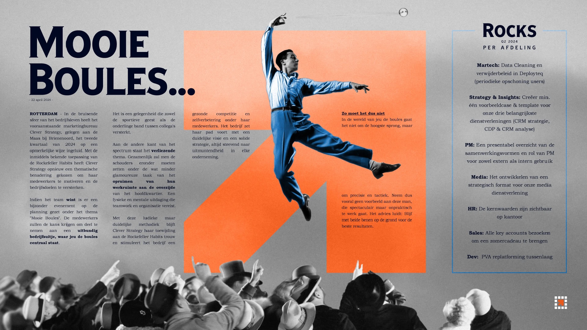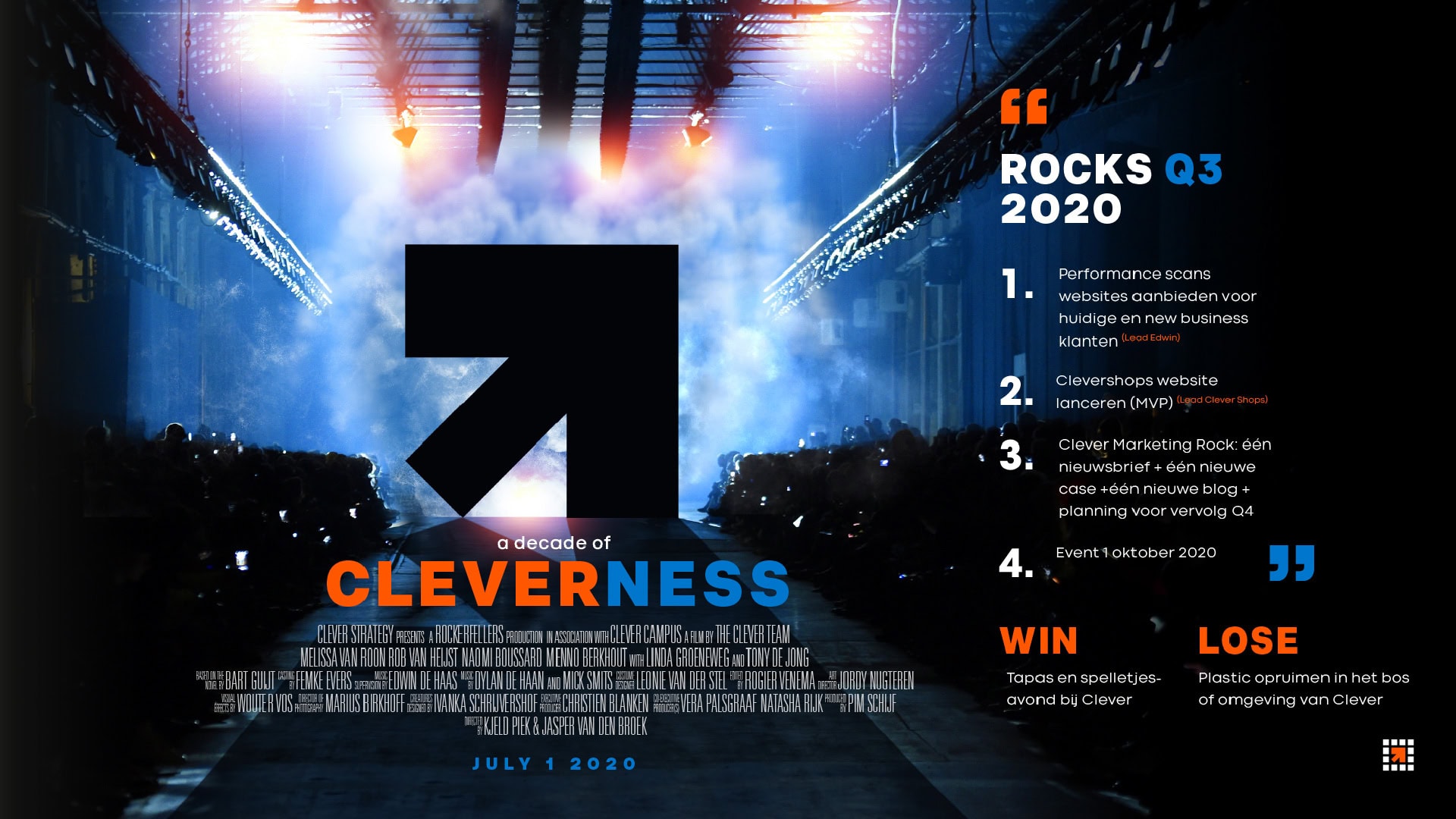 Onze kwartaaldoelstelling worden ook wel Rocks genoemd. Iedereen denkt mee aan 3 doelen en een thema. Hierin wordt een keuze gemaakt en elk doel wordt toegewezen aan een eindverantwoordelijke. Als onze gekozen kwartaaldoelstellingen behaald zijn, kiezen we met zijn allen een leuke beloning (vaak een gezellig teamuitje). Zijn de doelstellingen niet behaald? Dan gaan we een ‘lose’ aan, waarbij we bijvoorbeeld aan het werk gaan voor een goed doel.