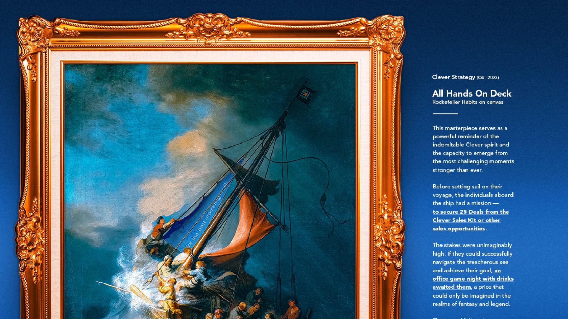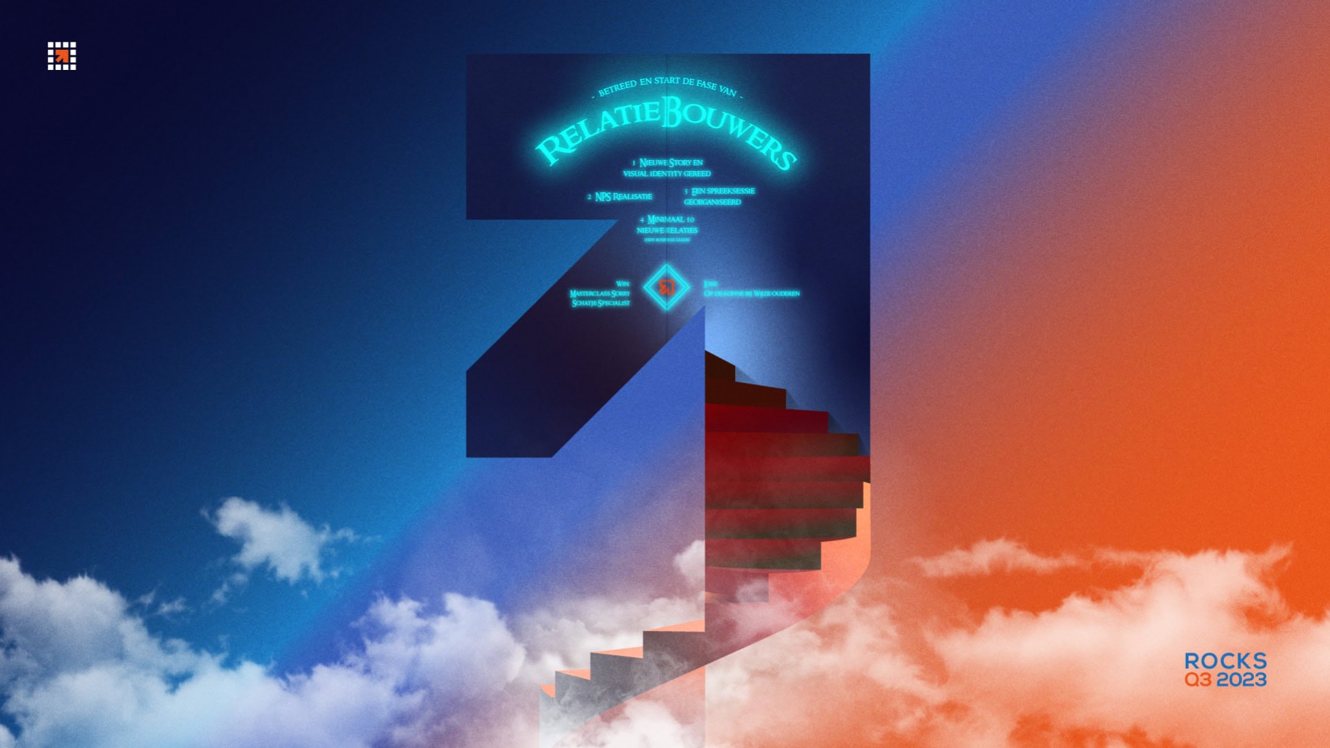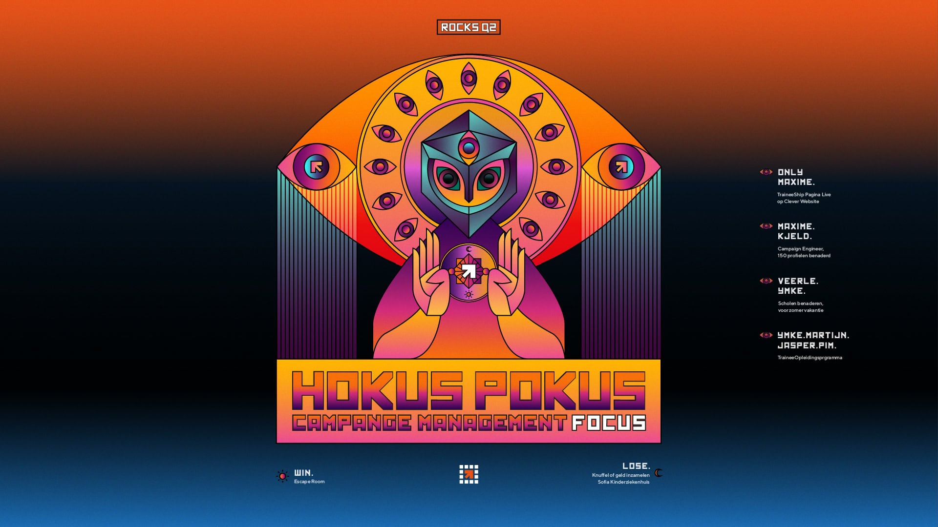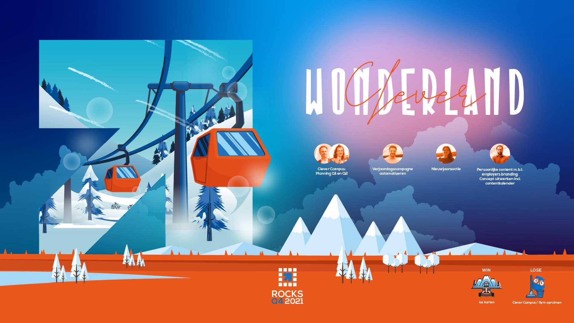 Onze kwartaaldoelstelling worden ook wel Rocks genoemd. Iedereen denkt mee aan 3 doelen en een thema. Hierin wordt een keuze gemaakt en elk doel wordt toegewezen aan een eindverantwoordelijke. Als onze gekozen kwartaaldoelstellingen behaald zijn, kiezen we met zijn allen een leuke beloning (vaak een gezellig teamuitje). Zijn de doelstellingen niet behaald? Dan gaan we een ‘lose’ aan, waarbij we bijvoorbeeld aan het werk gaan voor een goed doel.